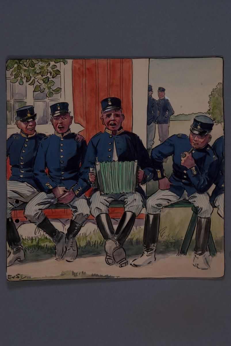 Soldater sjunger och spelar dragspel, teckning av Einar von Strokrich.