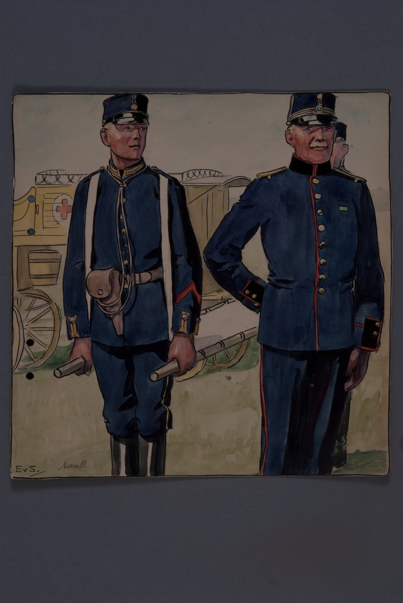 Soldater vid trängen med sjukbår framför sjukvagn, teckning av Einar von Strokrich.