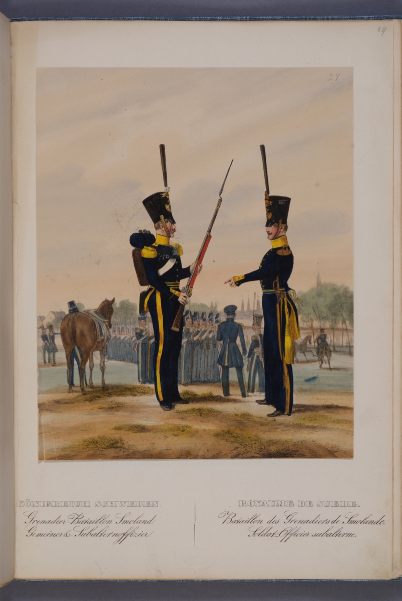 Plansch med uniform för manskap och subalternofficer vid Smålands grenadjärbataljon. Ingår i planschsamlingen Das europäische Heer in charakteristischen Gruppen: Scweden, utgiven av Eckert und Monten ca 1840.