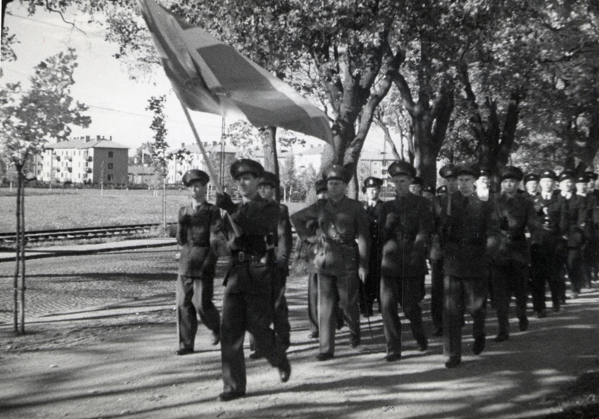 Fanvakt paraderar vid uppvisning på Arméns underofficersskola (Försvarets läroverk) i Uppsala 1949. I bakgrunden syns järnvägen och bostadshus.