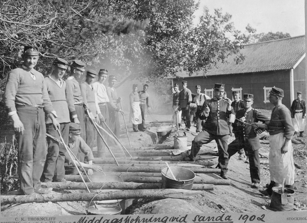 Fanjunkare provsmakar middagsmålet vid kokgroparna på Sanna hed 1902.
