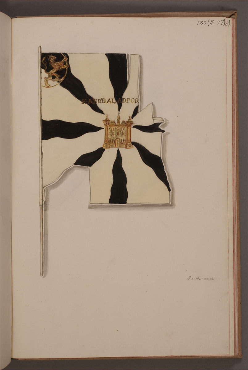 Titel: Avbildning i gouache föreställande fälttecken taget som trofé av svenska armén. Den avbildade fanan finns delvis bevarad i Armémuseums samling, för mer information, se relaterade objekt.