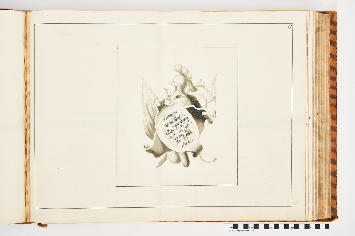 Kartusch till bokverk med avbildningar föreställande äldre svenska eldrör förvarade på fästningar samt eldrör erövrade åren 1598-1679, utförda av syskonen Anna Maria och Philip Jakob Thelott. Avser ritningar över polska troféer tagna under kung Gustaf Adolfs, Karl IX:s och Karl Gustafs regementstider ifrån år 1598 till år 1658.