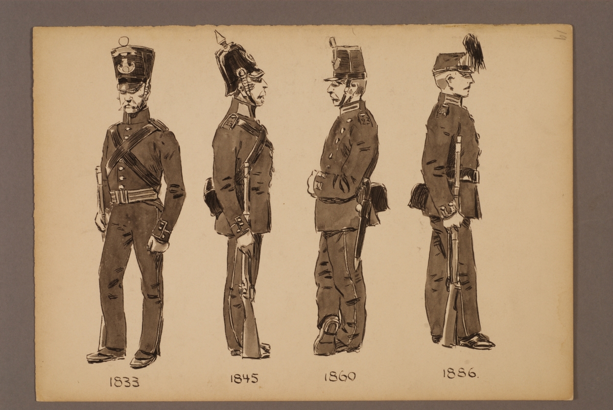 Plansch med huvudbonad för Jämtlands fältjägarregemente för åren 1833-1886, ritad av Einar von Strokirch.
