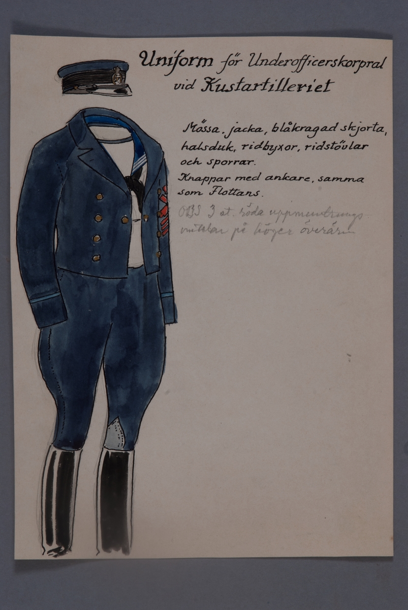 Uniformsteckning i original av Einar von Strokirch, för underofficerskorpral vid Kustartilleriet.