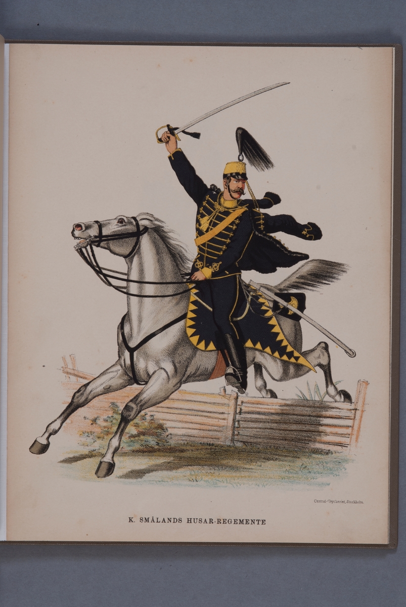 Plansch i färgtryck med uniform för Smålands husarregemente. Ingår i boken Svenska arméns och flottans uniformer, utgiven av P.B Eklund 1891.