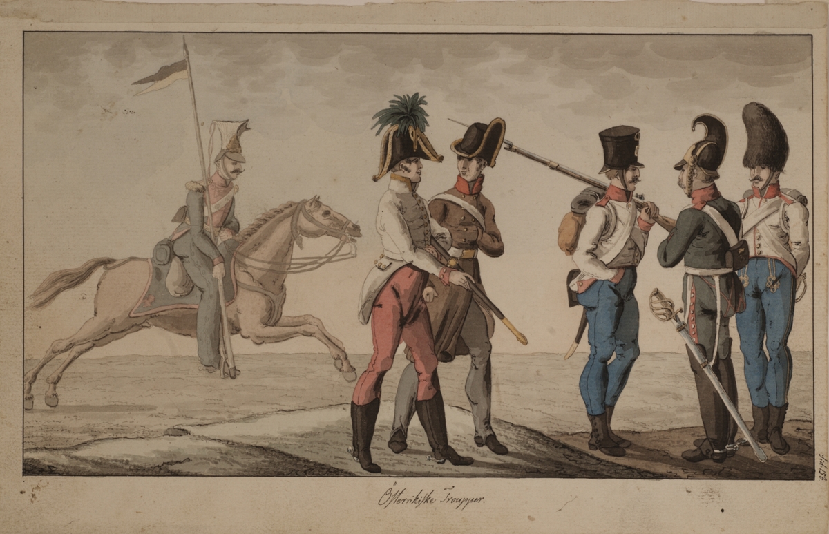 Österrikiska trupper. Originalteckning i färg av Carl Johan Ljunggren.