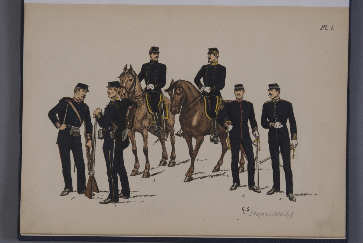 Plansch med uniform för Generalitetet, Generalstaben, Svea livgarde och Andra livgardet. Ingår i planschsamlingen Svenska armén - 7 planscher i färgtryck, utgiven av Otto Holmgren.