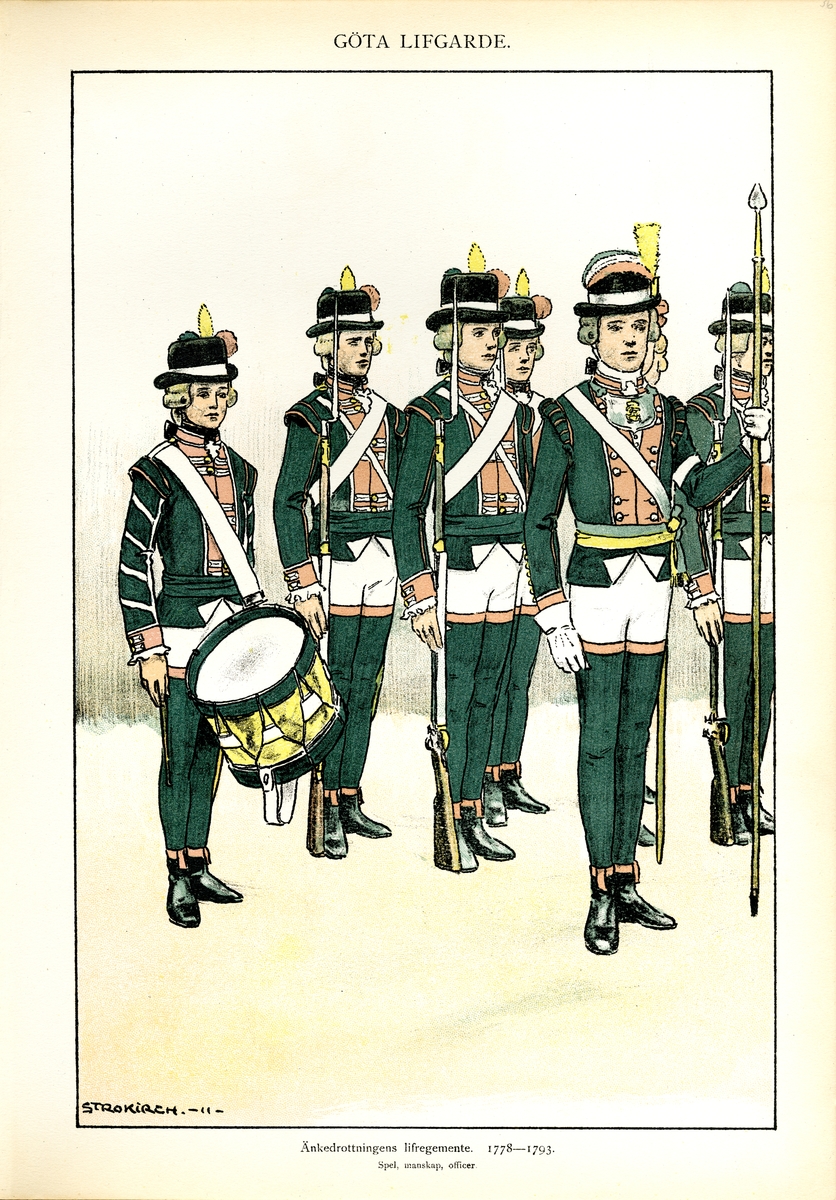 Plansch med uniform för spel, manskap och officer vid Göta livgarde och Änkedrottningens livregemente för åren 1778-1793, ritad av Einar von Strokirch. Ingår i planschsamlingen Svenska arméns munderingar 1680-1905.