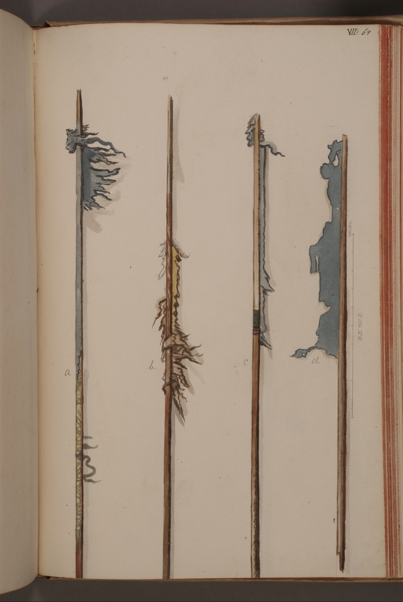Avbildning i gouache föreställande fanstänger tagna som troféer av svenska armén. Stången längst till höger i bild finns bevarad i Armémuseums samling, för mer information, se relaterade objekt.