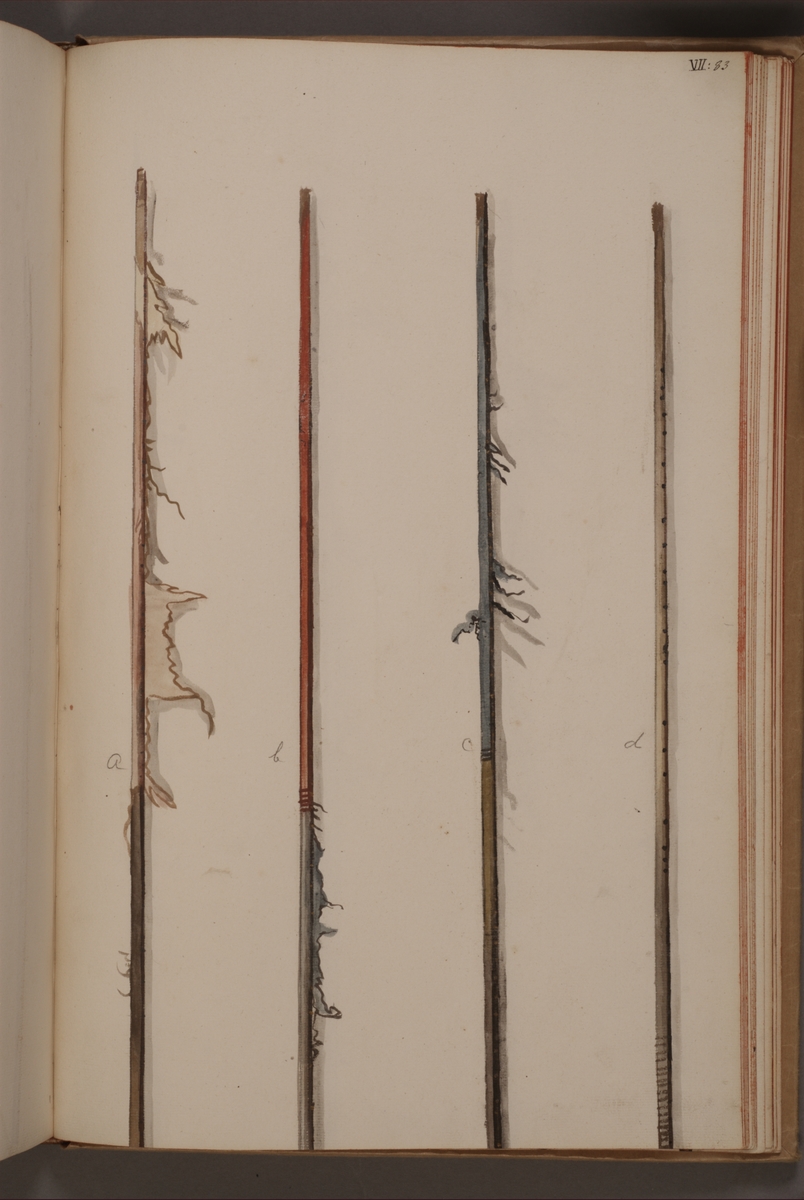 Avbildning i gouache föreställande fanstänger tagna som troféer av svenska armén. De avbildade stängerna finns inte bevarade i Armémuseums samling.