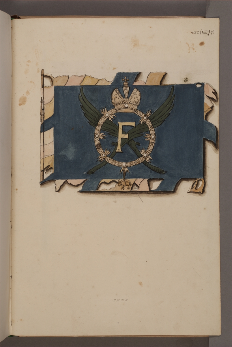 Avbildning i gouache föreställande fana tagen som trofé av svenska armén. Den avbildade fanan finns bevarad i Armémuseums samling, för mer information, se relaterade objekt.