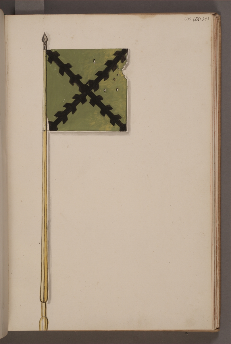 Avbildning i gouache föreställande fälttecken taget som trofé av svenska armén. Det avbildade standaret finns bevarat i Armémuseums samling, för mer information, se relaterade objekt.