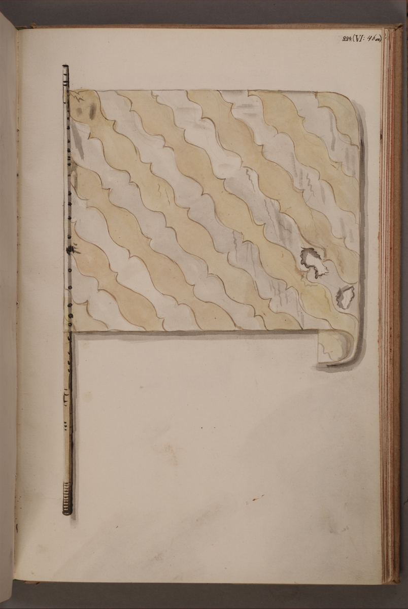 Avbildning i gouache föreställande fälttecken taget som trofé av svenska armén. Den avbildade fanan finns inte bevarad i Armémuseums samling.
