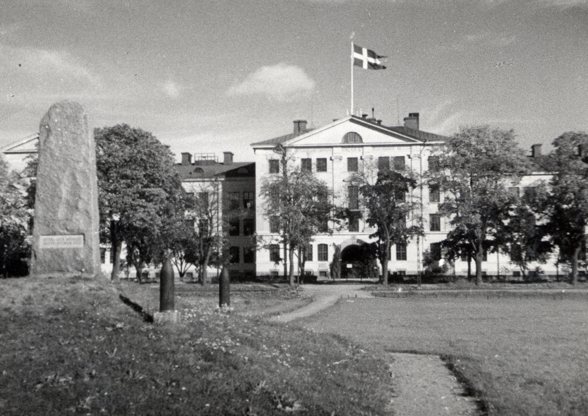 Titel: Kanslihuset vid Arméns underofficersskola i Uppsala (Försvarets Läroverk) fotograferat 1949.