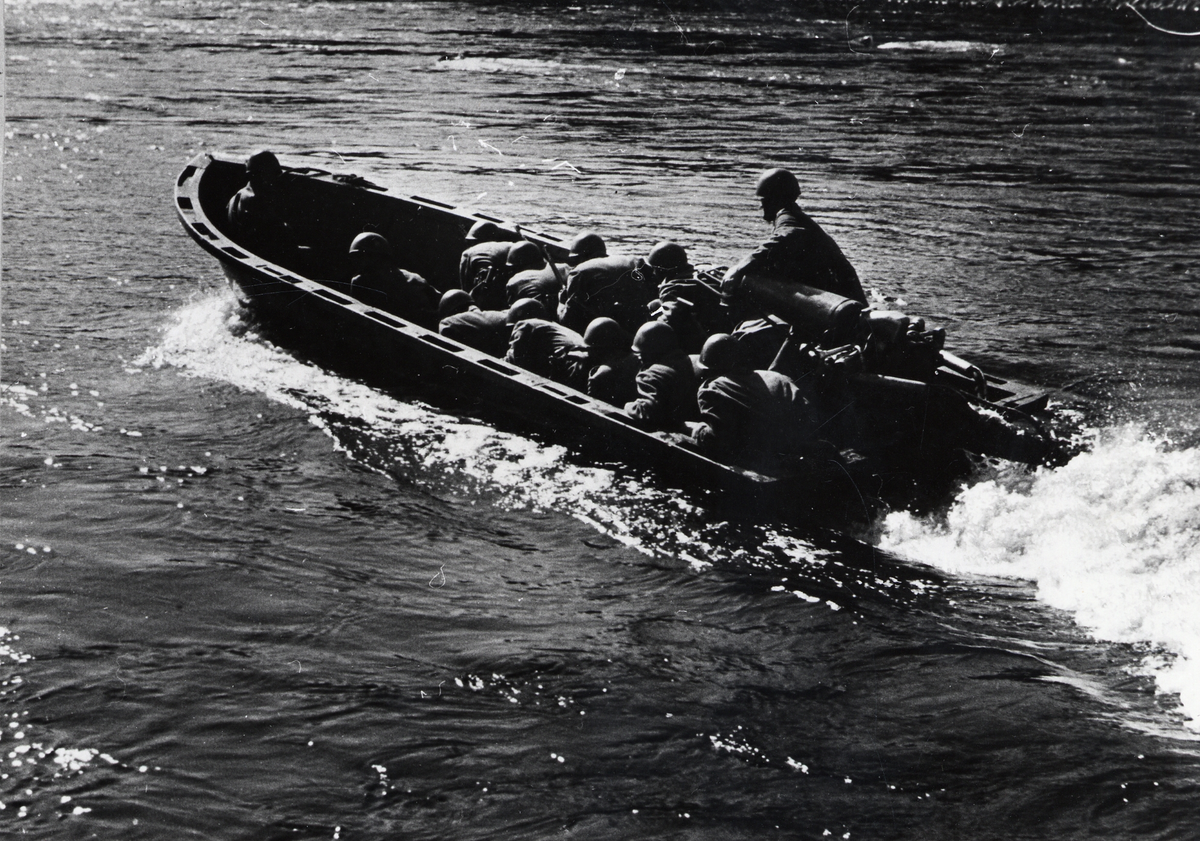 Ingenjörstrupper, soldater i uniform m/1939 i en stormbåt. Bild från 1940-tal.