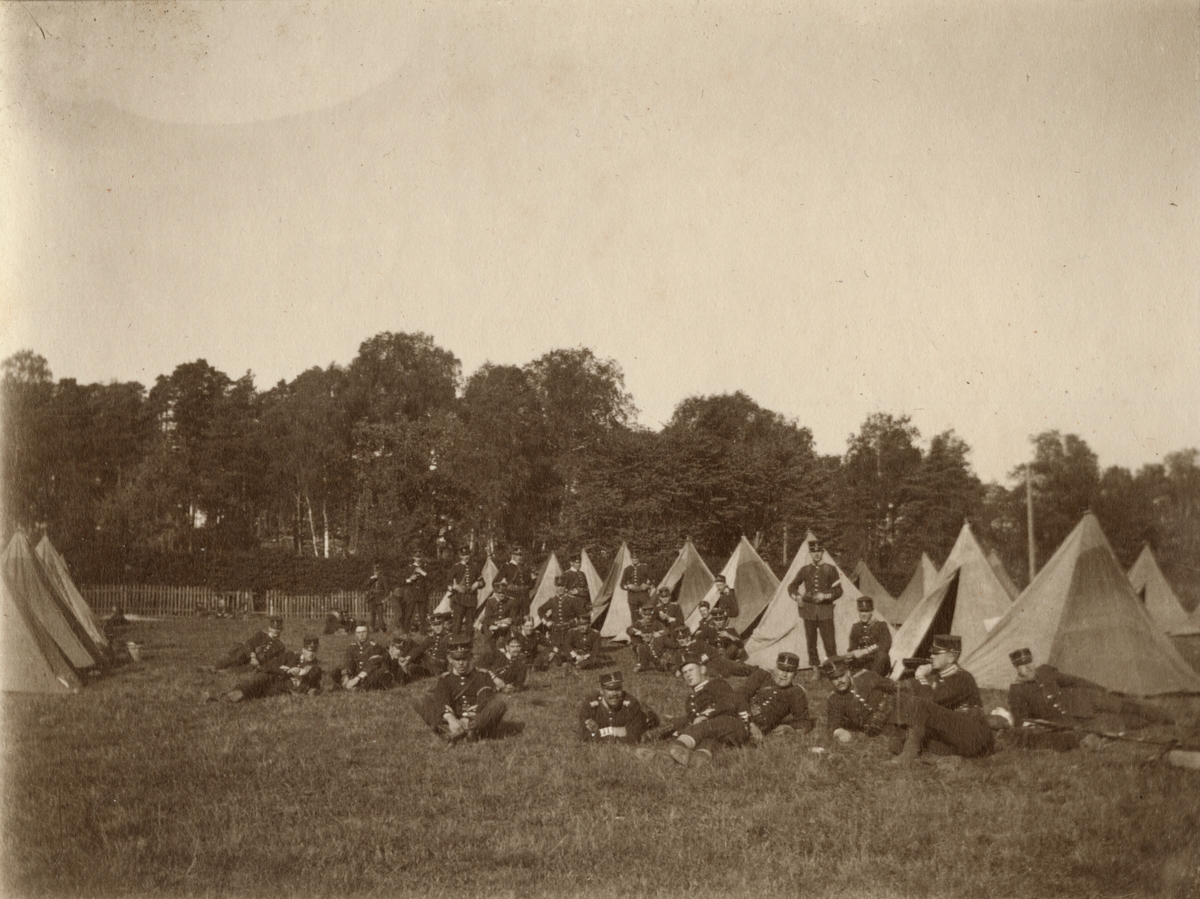 Titel: Gruppbild med soldater från Göta livgarde I 2 framför tältläger.