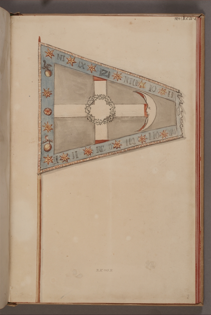 Avbildning i gouache föreställande fälttecken taget som trofé av svenska armén. Den avbildade vimpeln finns bevarad i Armémuseums samling, för mer information, se relaterade objekt.