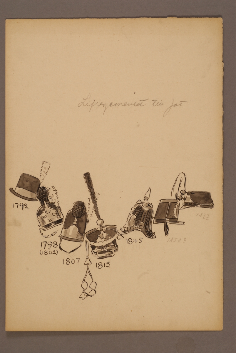 Plansch med huvudbonader för Livregementet till fot, ritad av Einar von Strokirch.
