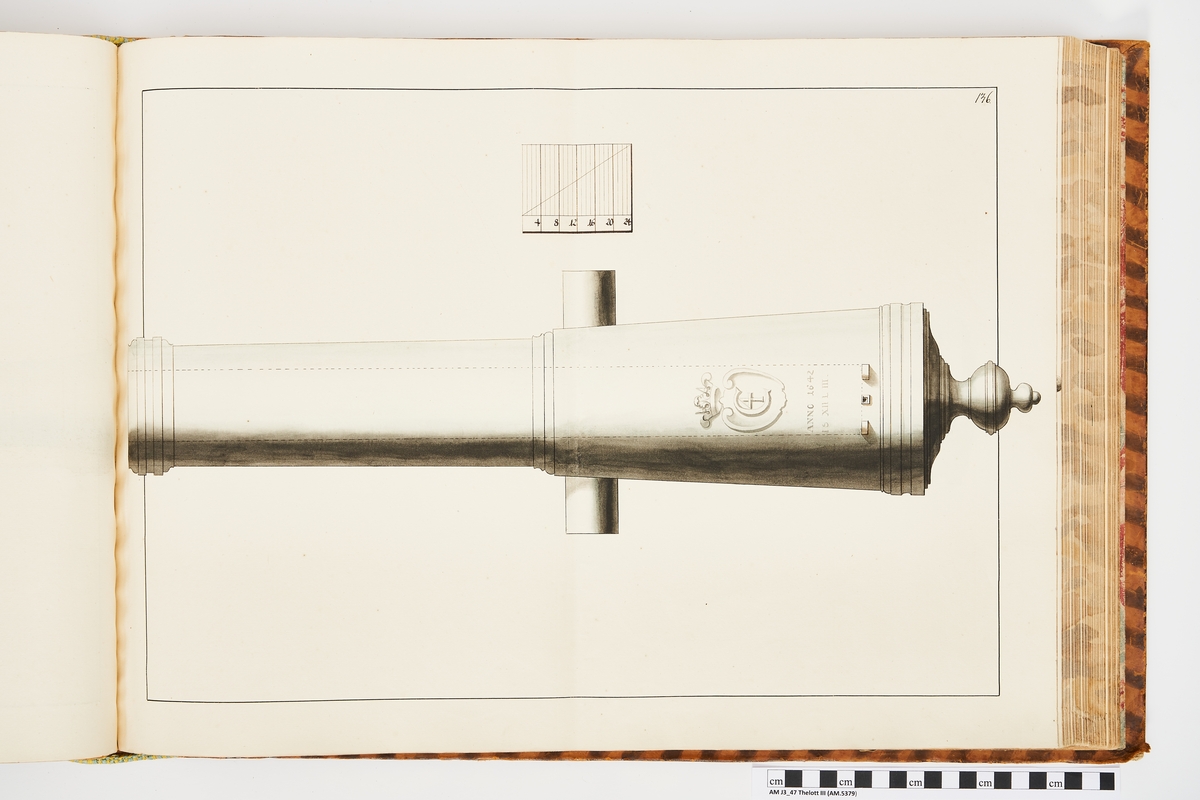Titel: Avbildning föreställande dansk trofé med Kristian IV:s vapen. Ingår i volym med avbildade äldre svenska eldrör förvarade på fästningar samt eldrör erövrade åren 1598-1679.