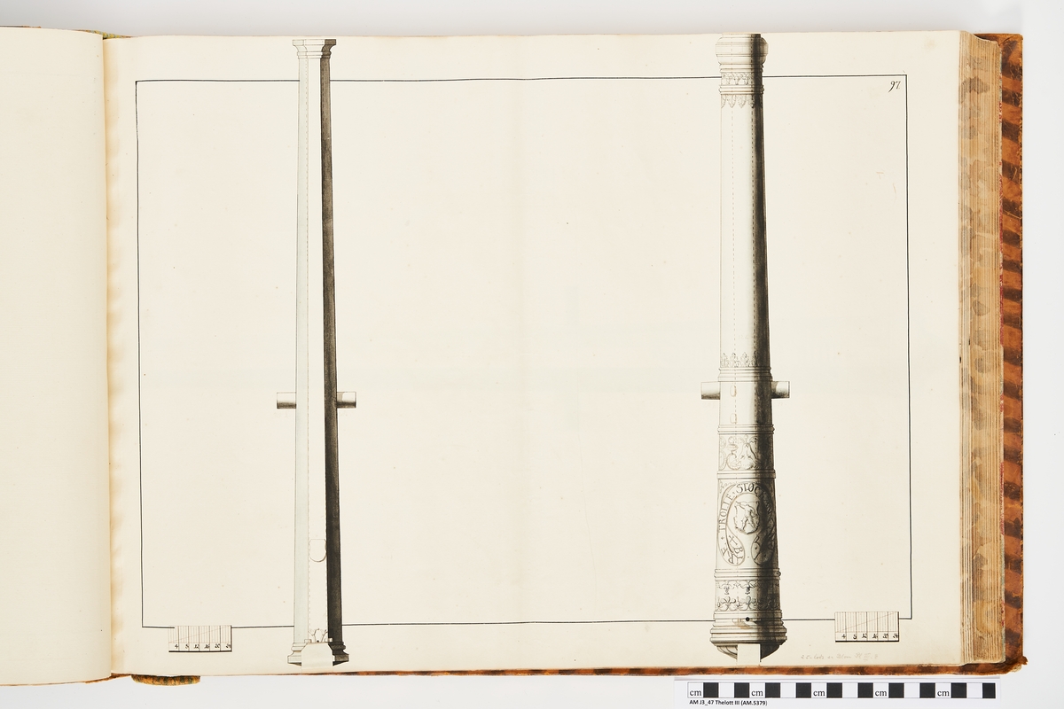 Avbildning föreställande danska troféer tagna med fästningen Malmö. Ingår i volym med avbildade äldre svenska eldrör förvarade på fästningar samt eldrör erövrade åren 1598-1679.