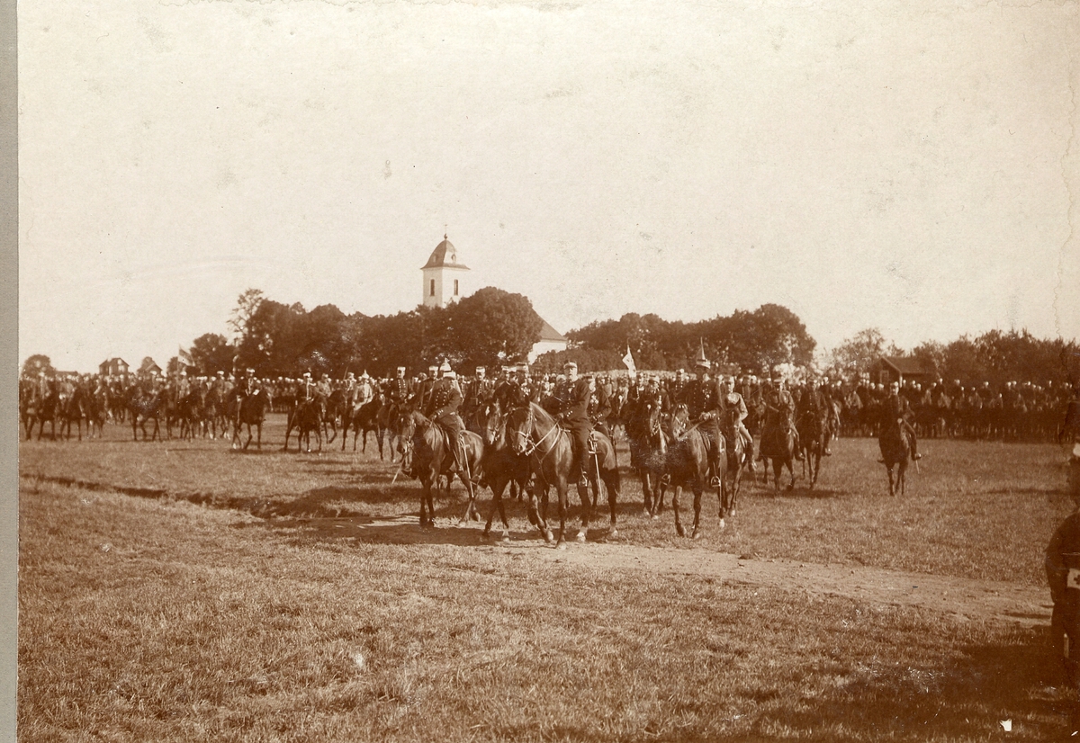 Kavalleritrupp ledd av kung Oscar II framför kyrka.