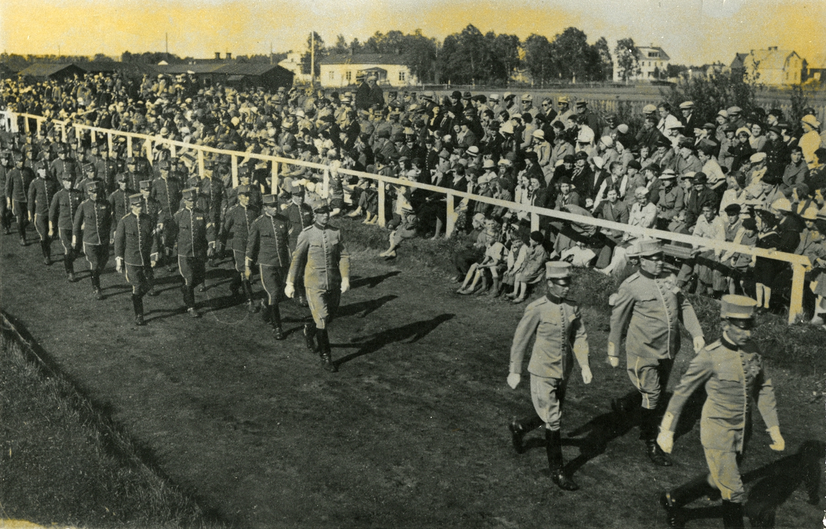 Norrlands dragonregemente K 8, 3:e skvadron paraderar på dåvarande Bandyvallen i Boden på Svenska Flaggans dag 1937.