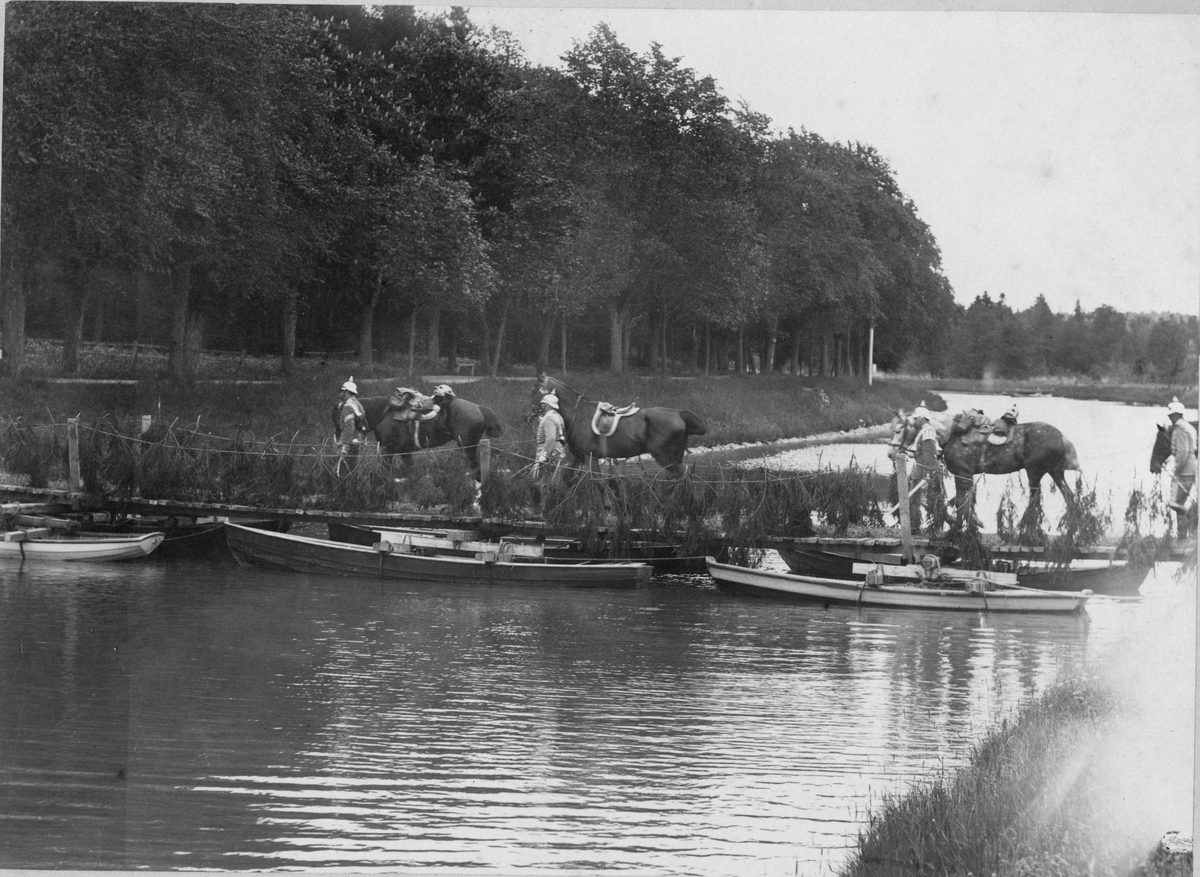 Soldater ur Livregementet till häst K 1,leder hästar på smal bro över Djurgårdsbrunnskanalen.