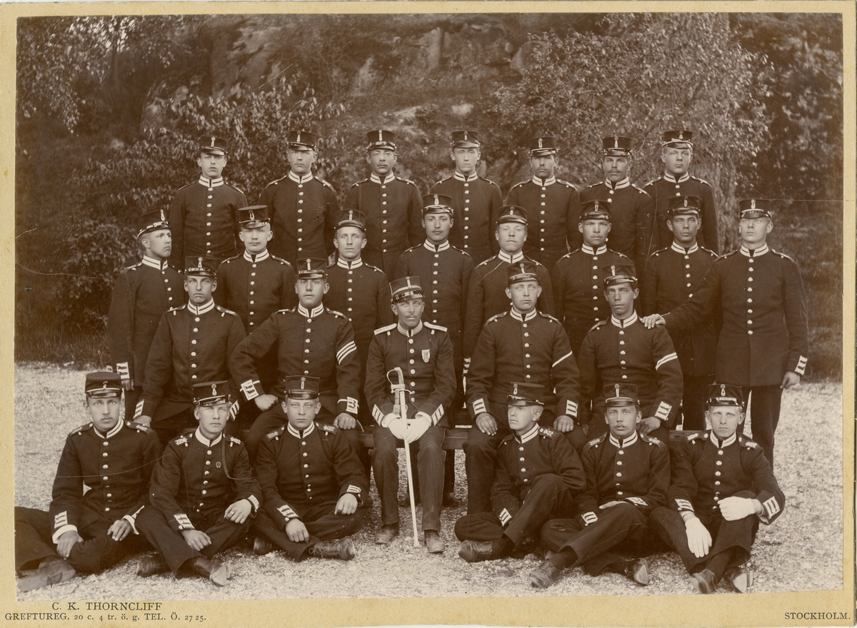 Grupporträtt av soldater vid Svea livgarde I 1 omkring 1900.
