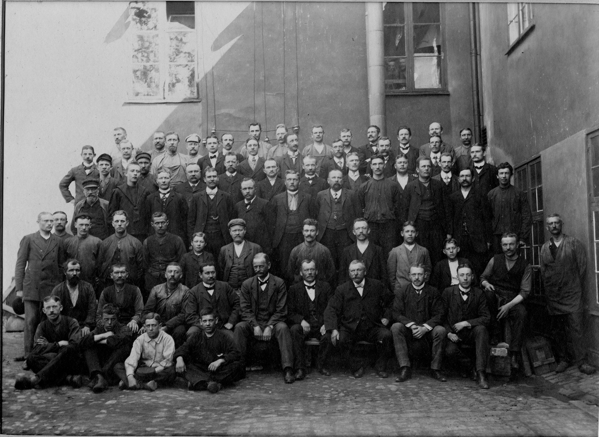 Titel: Grupporträtt av män utanför ena flygeln byggnaden på Artillerigården.