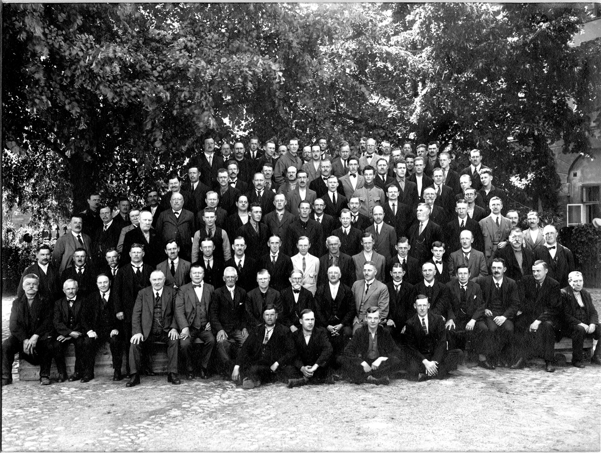Grupporträtt av män framför tyghusets (Armémuseum) östra del framför kastanjerna, 1925.