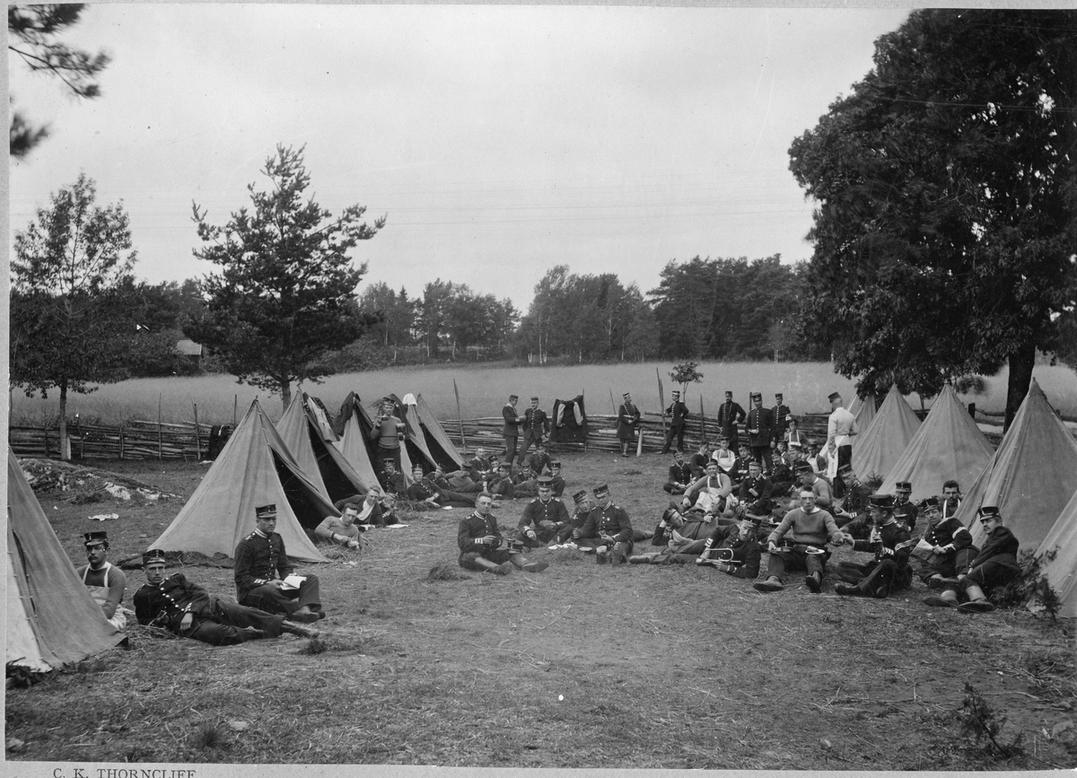 Göta livgarde I 2, kommissariekurs. Beväringar utanför bivack, på Järvafältet(?).