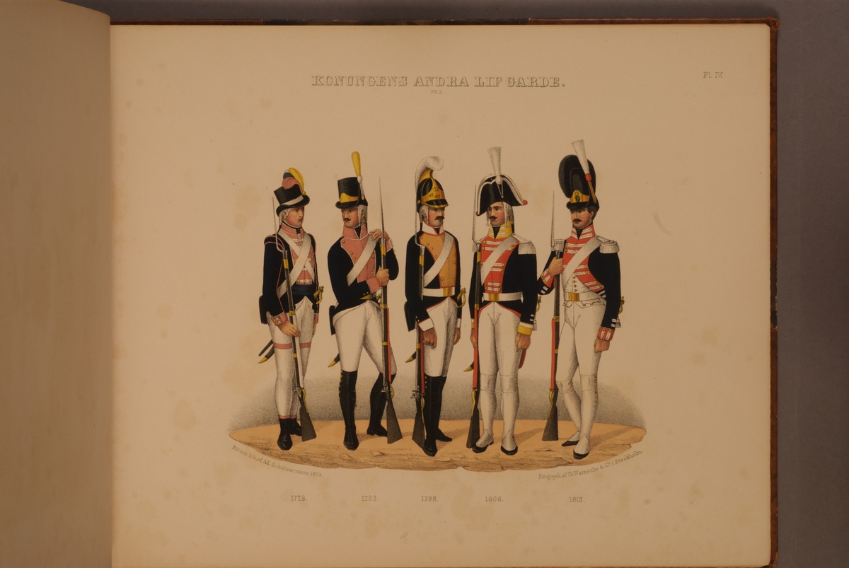 Plansch med uniform för Andra livgardet för åren 1778-1813. Plansch i färgtryck efter original av Adolf Ulrik Schützercrantz. Ingår i planschsamlingen Svenska krigsmaktens fordna och närvarande munderingar.