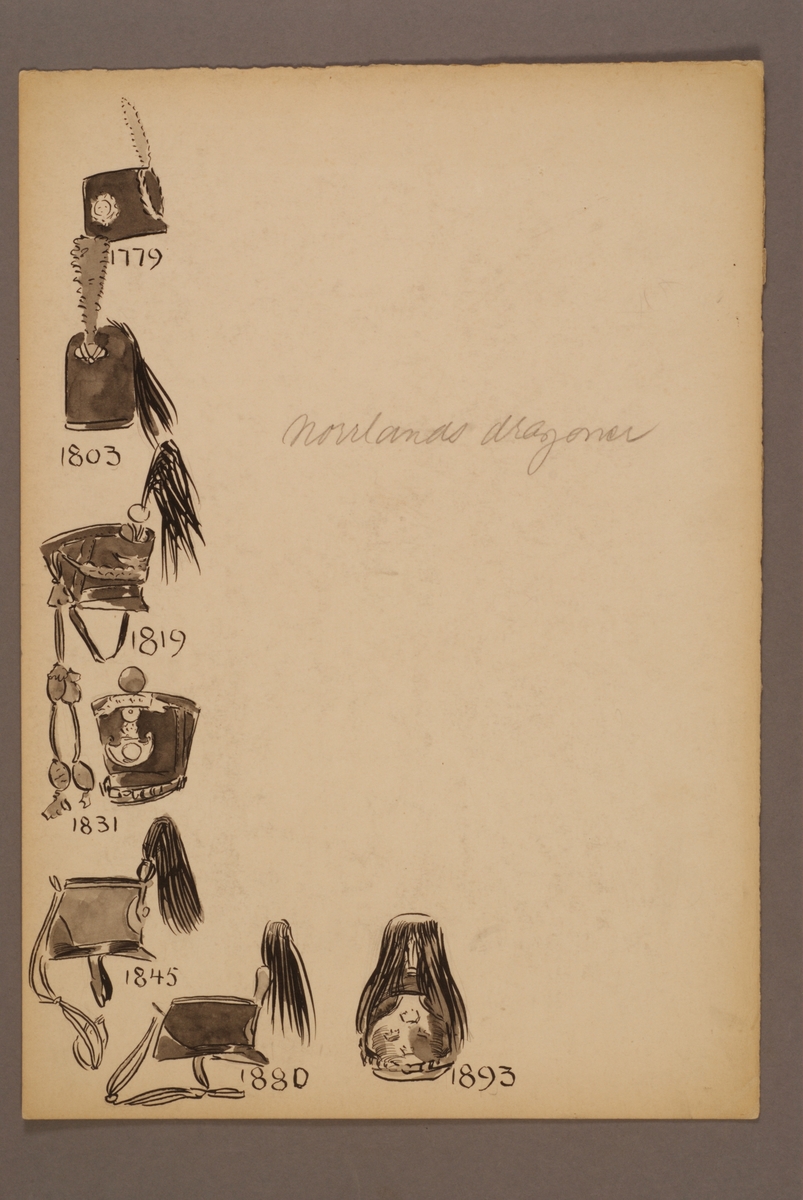 Plansch med huvudbonader för Norrlands dragoner för åren 1779-1893, ritad av Einar von Strokirch.