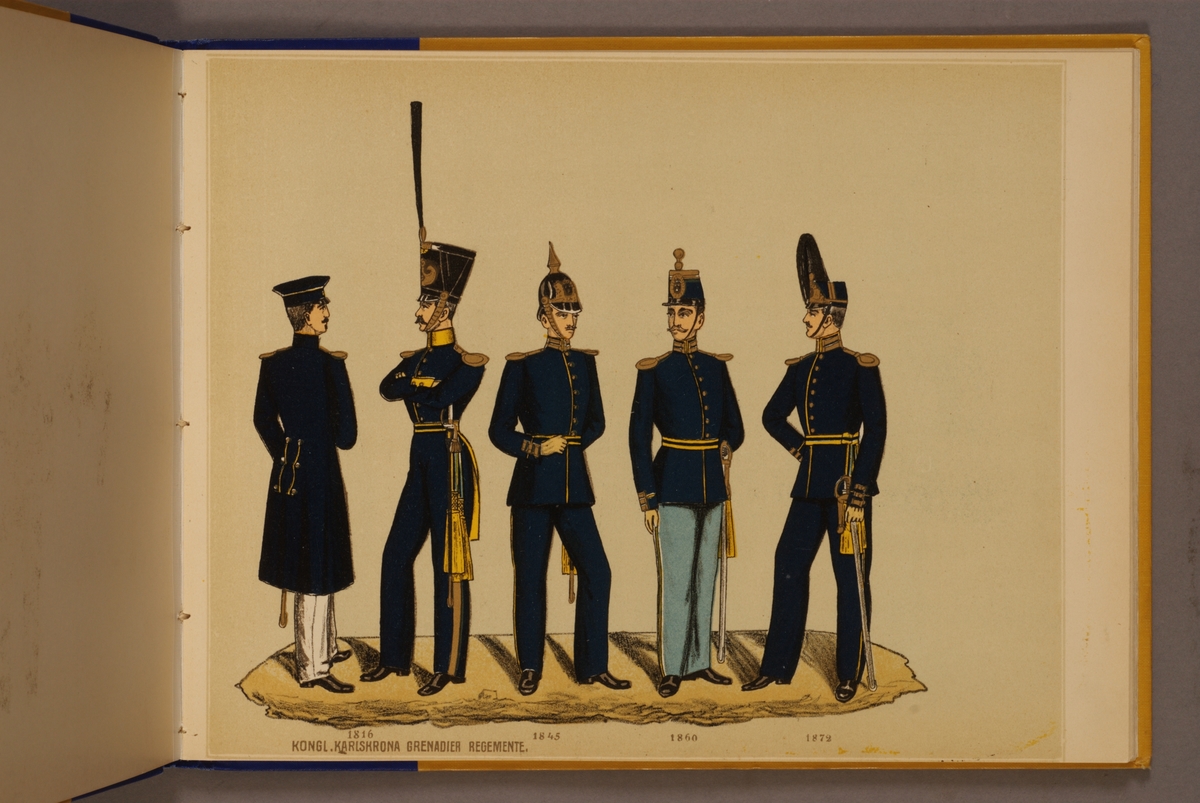 Plansch i färgtryck med uniform för Karlskrona grenadjärregemente för åren 1816-1872. Ingår i planschsamlingen Svenska arméns och flottans officersmunderingar utgiven av P.B Eklund.