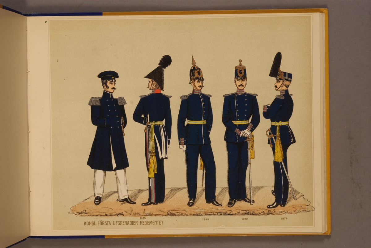 Plansch i färgtryck med uniform för Första livgrenadjärregementet för åren 1816-1872. Ingår i planschsamlingen Svenska arméns och flottans officersmunderingar utgiven av P.B Eklund.