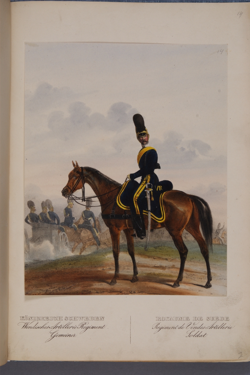 Plansch med uniform för manskap vid Wendes artilleriregemente. Ingår i planschsamlingen Das europäische Heer in charakteristischen Gruppen: Scweden, utgiven av Eckert und Monten ca 1840.