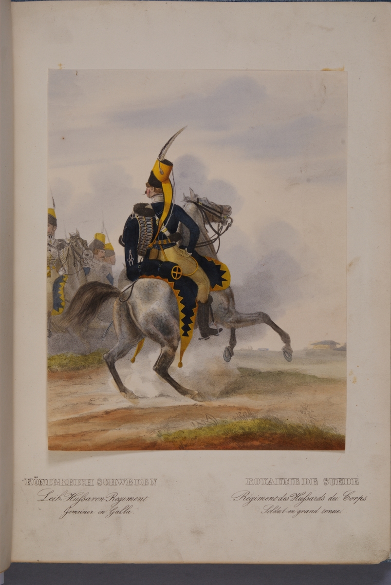 Plansch med uniform för manskap vid Livregementets husarer. Ingår i planschsamlingen Das europäische Heer in charakteristischen Gruppen: Scweden, utgiven av Eckert und Monten ca 1840.