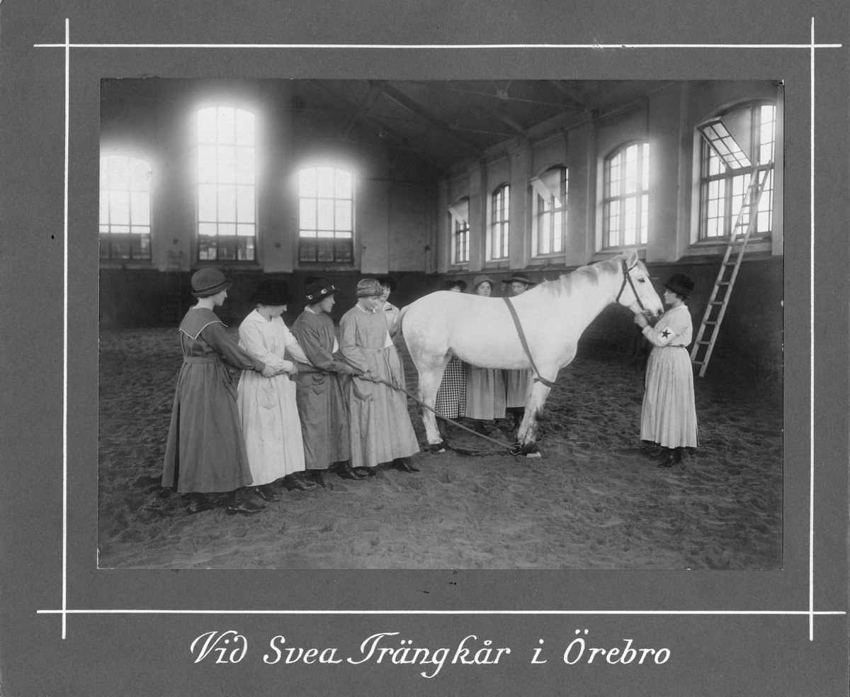 Svea Trängkår T 1 i Örebro, en grupp kvinnor med häst i ridhus.