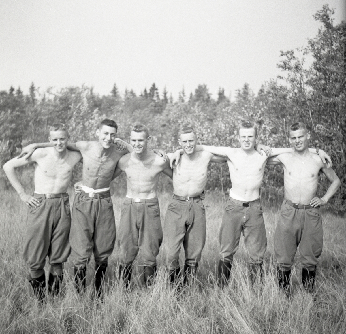 Värnpliktiga från Norrlands dragonregemente K4, Umeå i gruppbild med bar överkropp.