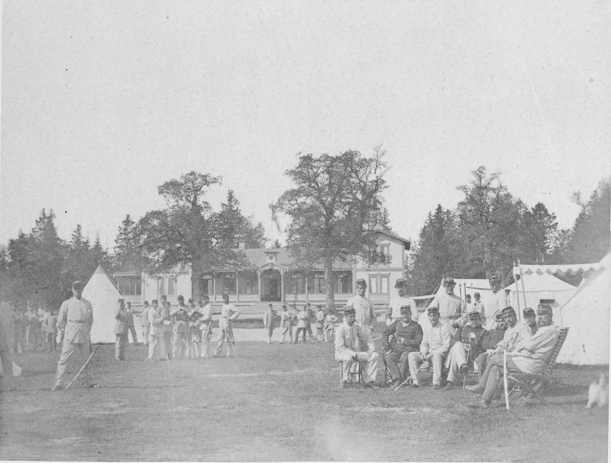 Soldater ur Västmanlands regemente I 18 samlade utanför tältläger vid Utnäs Löt vid tiden då Henrik Falkenberg var sekundchef.