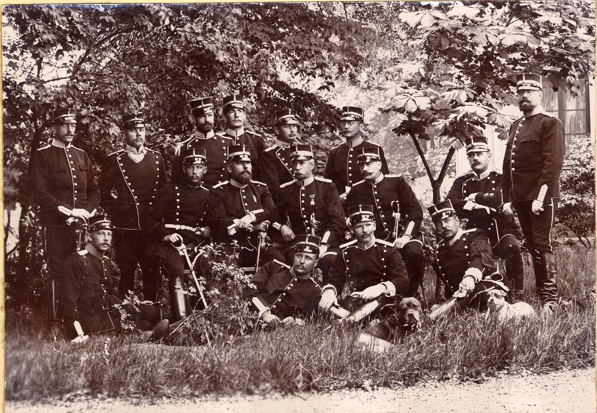 Gruppfoto av Svea trängbataljons T 1, officerskår med överste J. O. G. Smedmark i spetsen. Framför männen ligger två hundar i gräset.