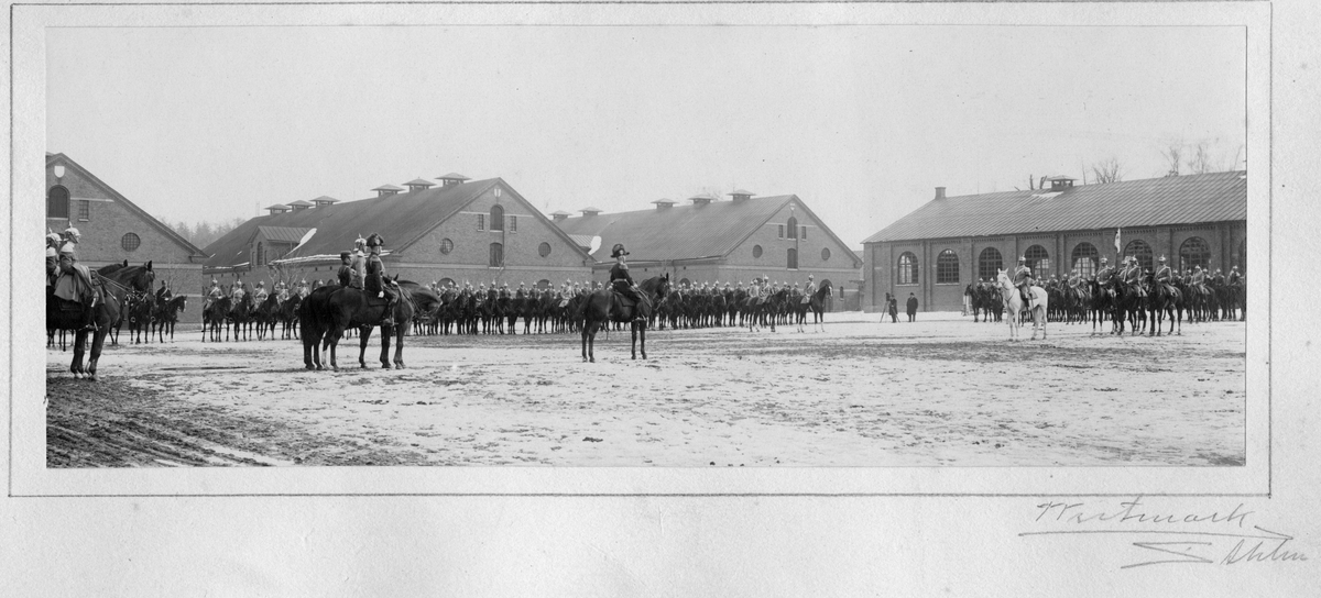 Livgardet till häst, K 1, uppställt framför stallbyggnaderna. I mitten konung Gustaf V.