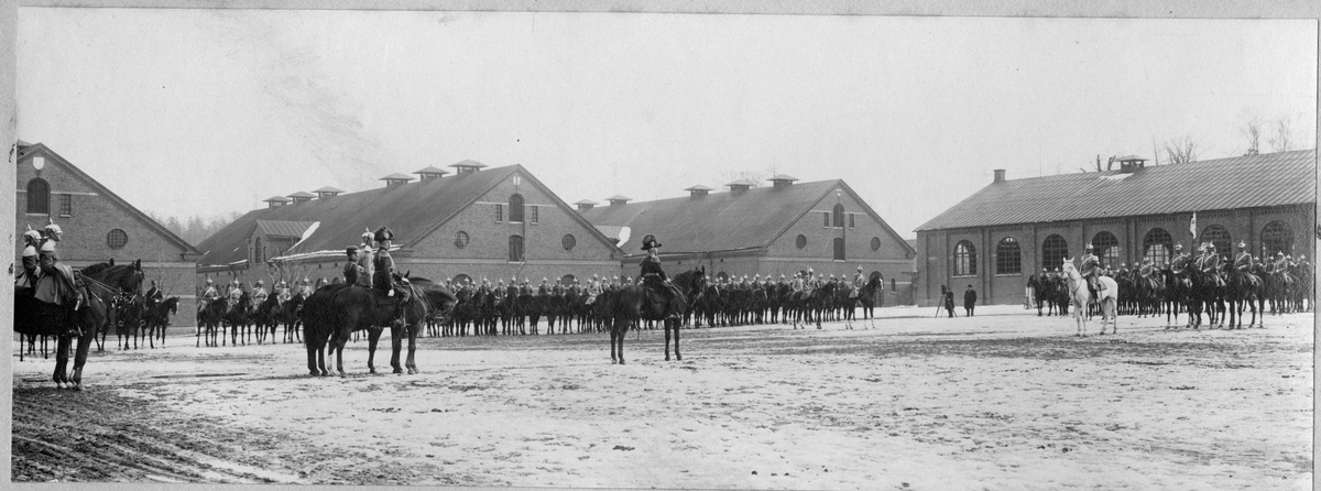 Livgardet till häst, K 1, uppställt framför stallbyggnaderna. I mitten konung Gustaf V.