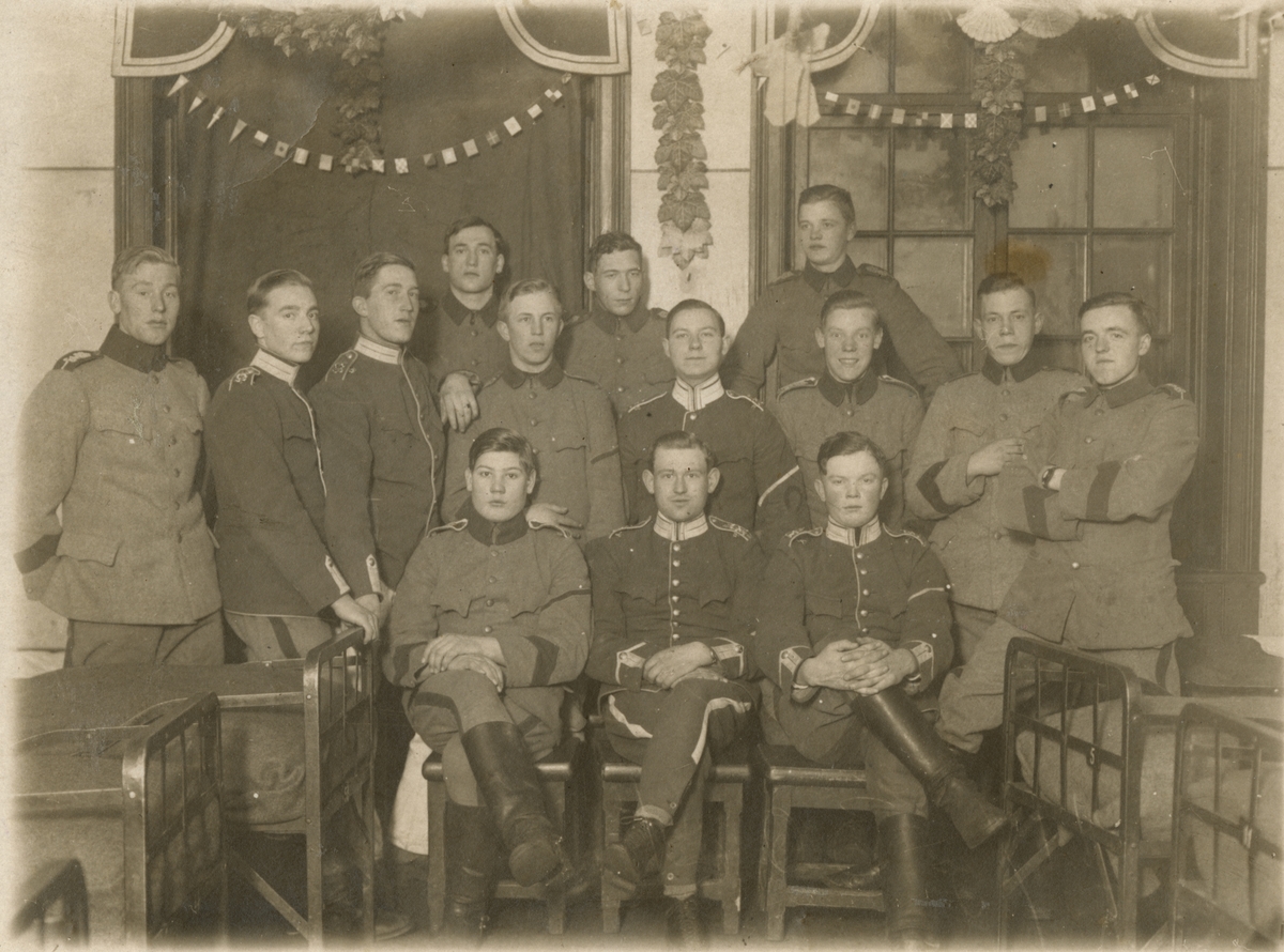 Titel: Gruppbild av soldater från Livgardet till häst K 1 i logementet.