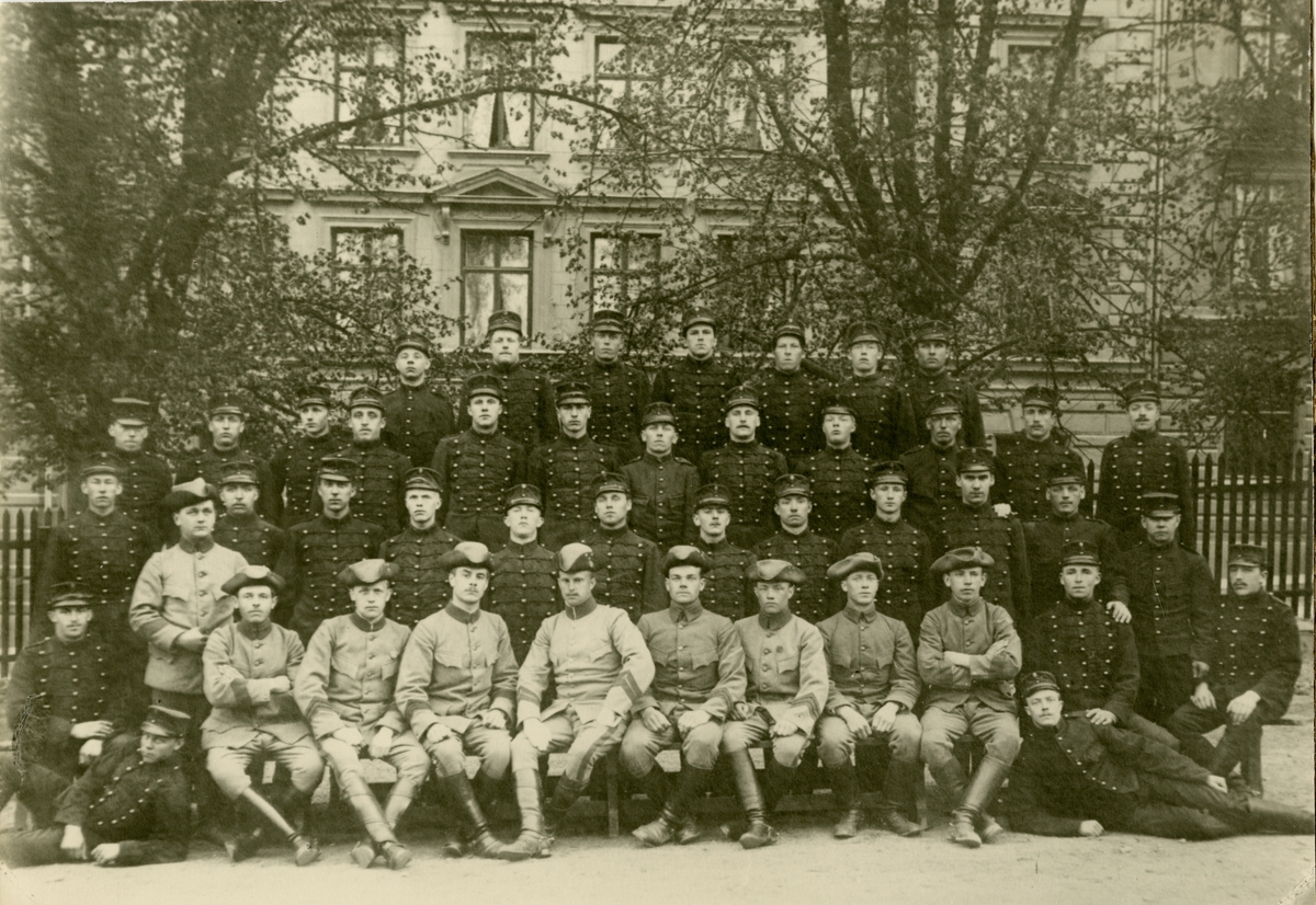 Grupporträtt av soldater vid Rekrytskolan, Positionsartilleriregementet A 9, 1910.