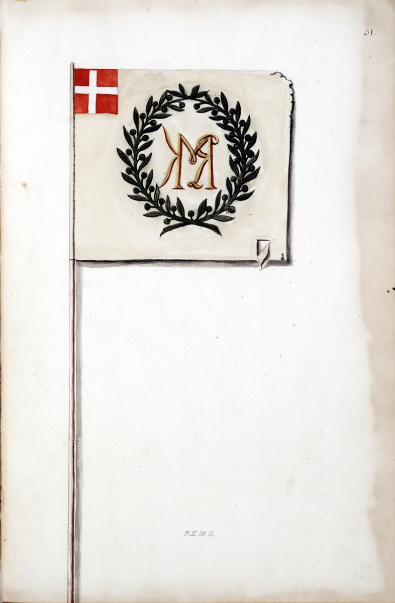 Avbildning i gouache föreställande kvartersfana tagen som trofé av svenska armén. Den avbildade kvartersfanan finns bevarad i Armémuseums samling, för mer information, se relaterade objekt.