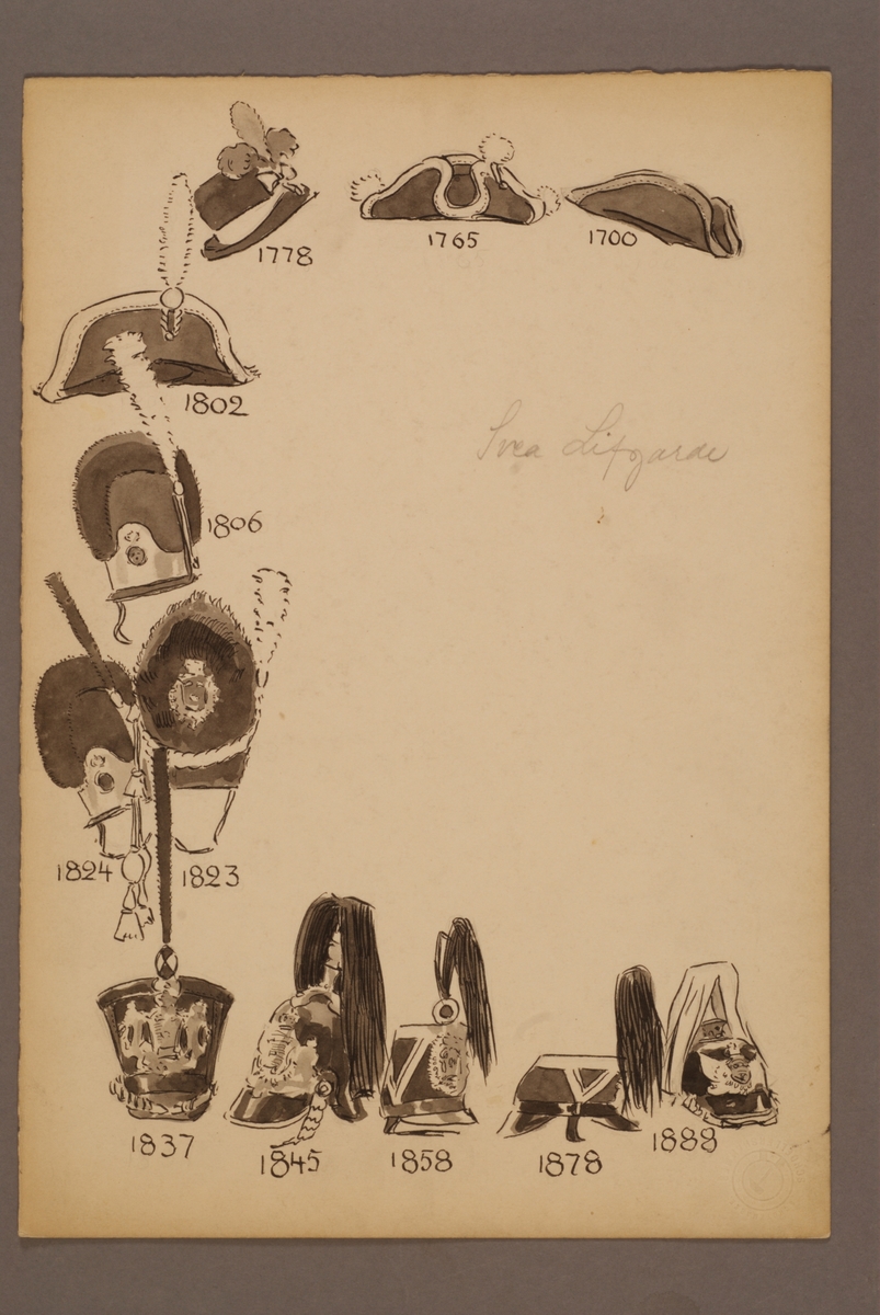 Plansch med huvudbonader för Svea livgarde för åren 1700-1888, ritad av Einar von Strokirch.