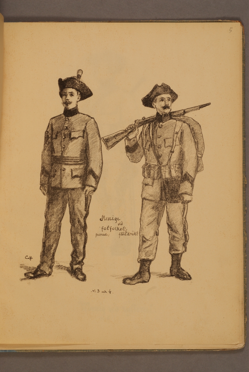 Menig vid fotfolket iförd paraduniform m/1906 och fältuniform m/1906. Illustration av Carl Hellström i skriften Huvudsakliga innehållet af Generalorder den 26 okt. 1906 n:r 1170-1176.