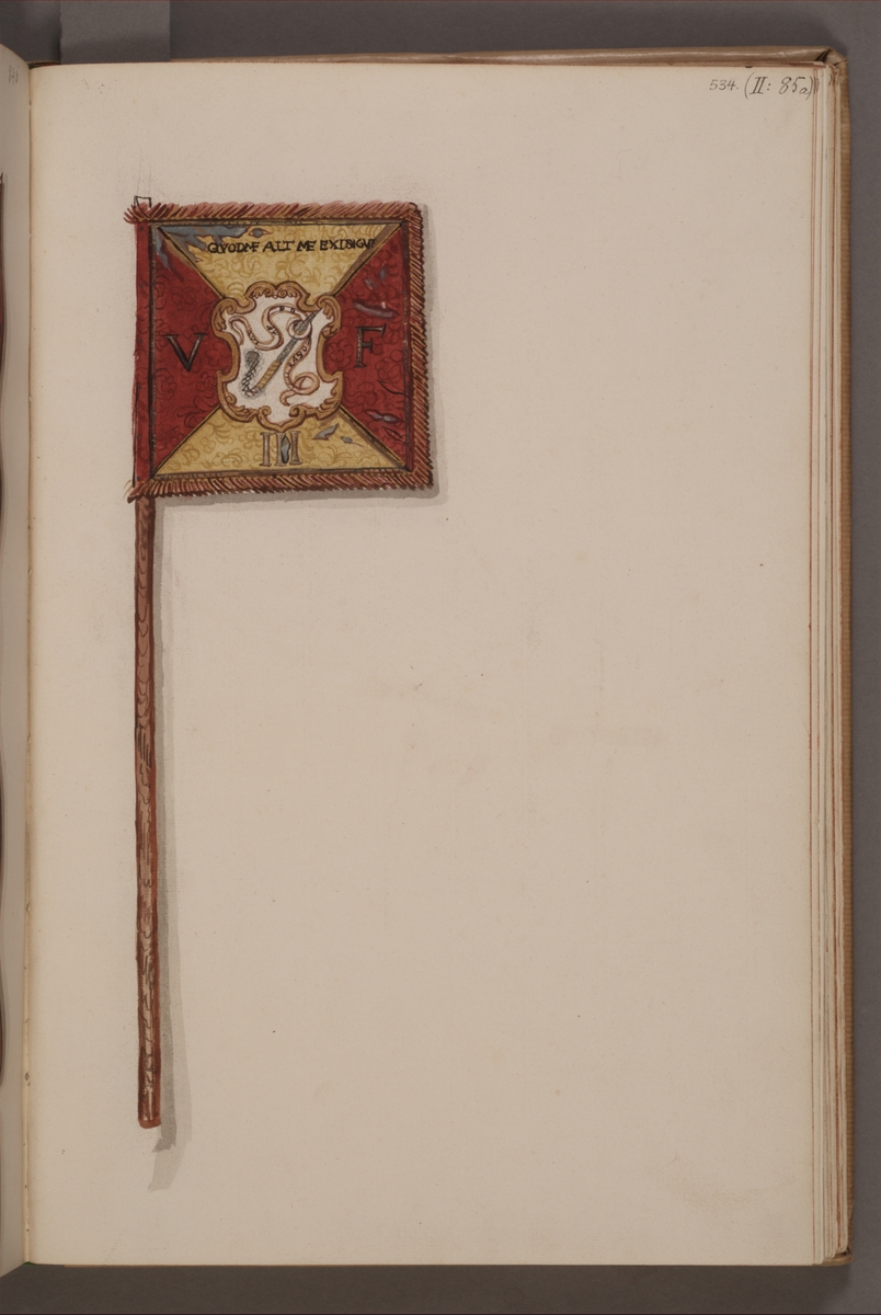 Avbildning i gouache föreställande fälttecken taget som trofé av svenska armén. Det avbildade standaret finns delvis bevarat i Armémuseums samling, för mer information, se relaterade objekt.